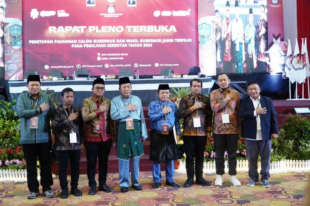 Pada rapat pleno ini KPU menetapkan pasangan Gubernur dan Wakil Gubernur Jambi Terpilih periode 2025-2030 yaitu pasangan H. Al Haris dan H. Abdullah Sani dengan perolehan suara 1.092. 823 suara atau 61, 01 persen.