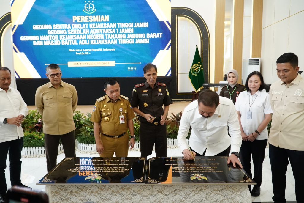 satoenews.com, Jambi – Gubernur Jambi Dr. H. Al Haris, S.Sos, MH menghadiri Peresmian Gedung Sentra Diklat Kejaksaan Tinggi Jambi, Gedung Sekolah Adhyaksa I Jambi, Gedung Kantor Kejaksaan Negeri Tanjung Jabung Barat, dan Masjid Baitul Adli Kejaksaan Tinggi Jambi, yang diresmikan langsung oleh Jaksa Agung RI, bertempat di Ballrom Prof. Dr. ST. Burhanuddin Sentra Diklat Kejaksaan Tinggi Jambi, Senin (17/02/2025).