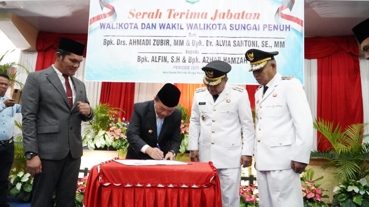 Dalam acara ini, Wali Kota Sungai Penuh sebelumnya, Drs. Ahmadi Zubir, MM menyerahkan jabatannya kepada Wali Kota terpilih Alfin, S.H. Sedangkan, Wakil Wali Kota sebelumnya, Dr. Alvia Santoni, SE., MM menyerahkan jabatannya kepada Wakil Wali Kota terpilih, Azhar Hamzah.Saat memberi sambutan dan arahan, Gubernur Al Haris menekankan kepada Bupati dan wakil Bupati untuk segera menyelesaikan pekerjaan rumah yang saat ini masih menjadi permasalahan di Kota Sungai Penuh.